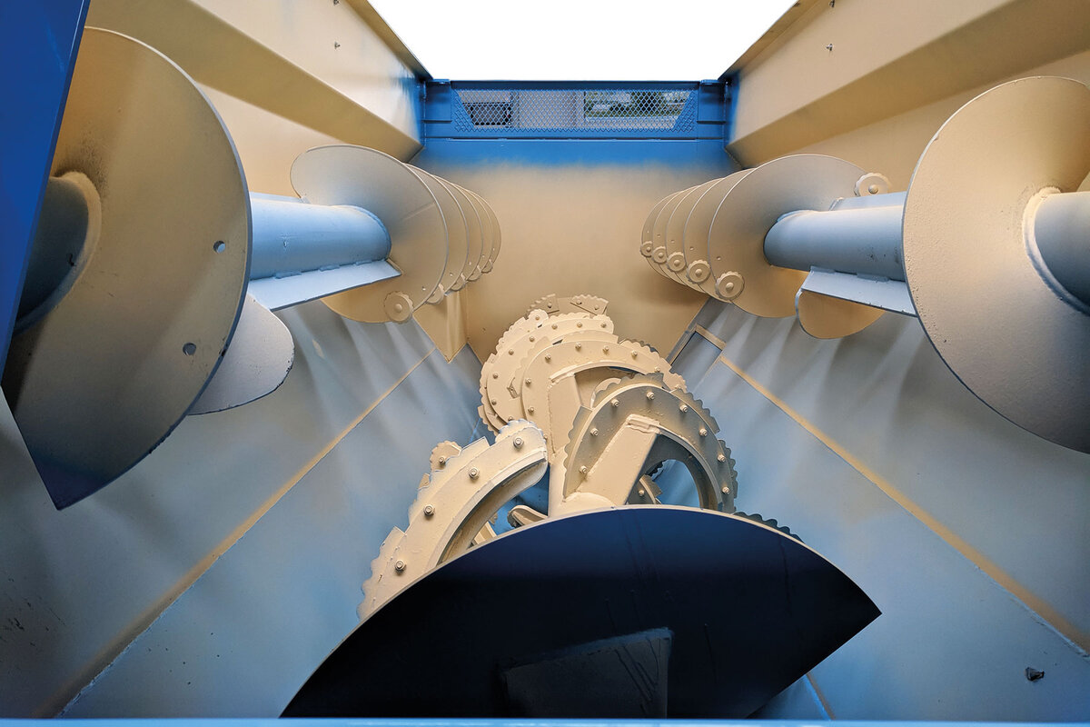 • Sehr hohe Volumenausnutzung durch nach innen drehende, obere Mischschnecken mit Gegenlauf