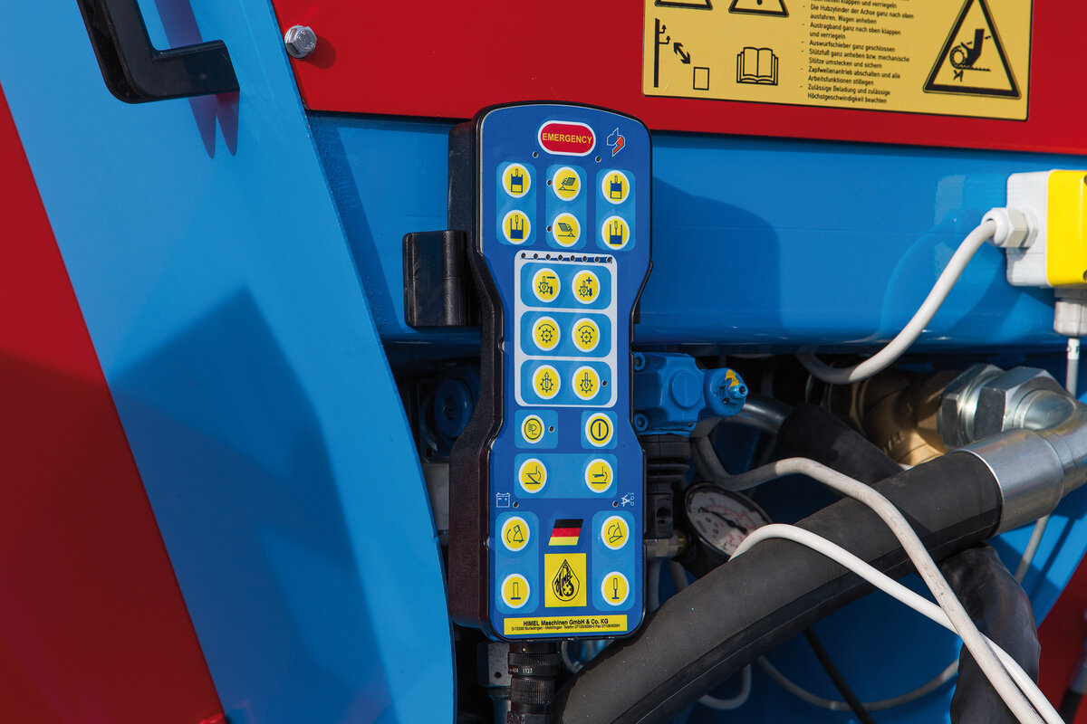Die Bordhydraulik lässt sich über die elektromagnetische Fernbedienung oder durch eine Flexzugsteuerung, bequem vom Schleppersitz aus bedienen.